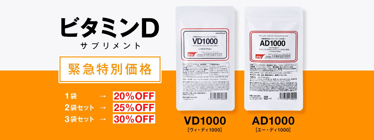 再びの緊急事態宣言を受け、日本機能性医学研究所では多くの皆さまにビタミンDをお届けできるよう「VD1000」「AD1000」の2商品を2021年1月5日より緊急値下げいたしました。緊急事態収束の見通しが立つまでの期間、特別価格にて提供いたします。