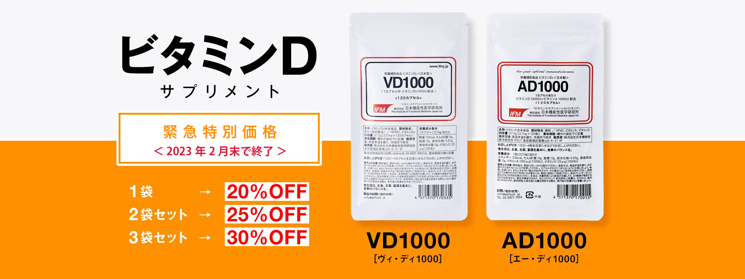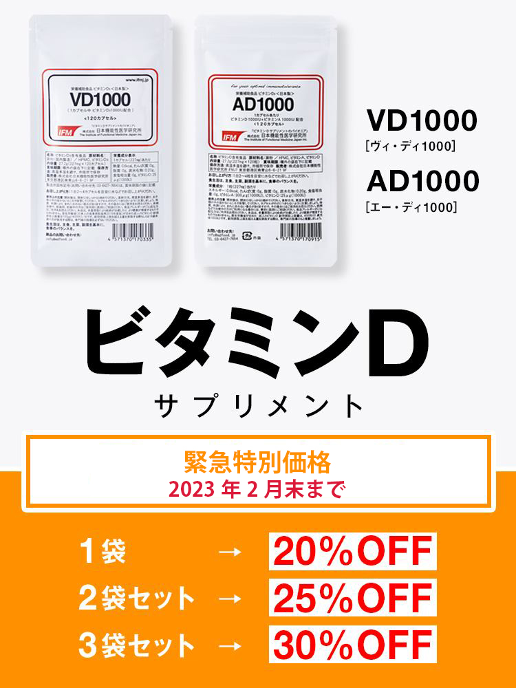 日本機能性医学研究所では多くの皆さまにビタミンDをお届けできるようビタミンDサプリを緊急値下げいたしました。第8波と冬のビタミンD低下に備えましょう!