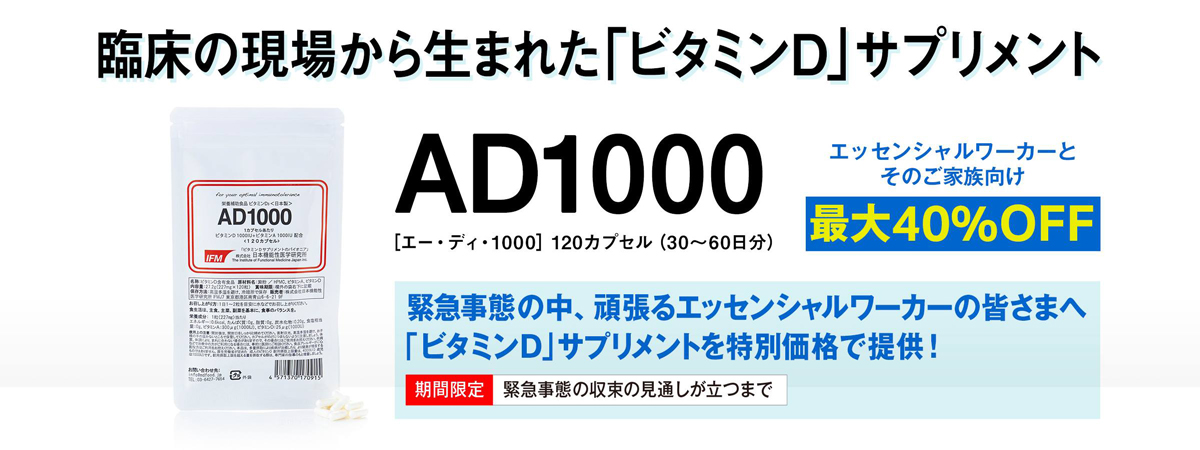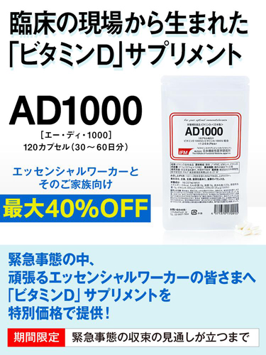 ⽇本機能性医学研究所(東京都港区/代表取締役:医師 斎藤糧三)は、コロナ禍で職務に励むエッセンシャルワーカーの皆さまを応援するため、2021年3⽉8⽇(月)よりビタミンDサプリメント「AD1000」を特別価格にて提供いたします。